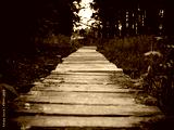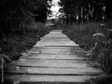 Wooden bridge in a forest. A clear path through the dark midwood. Outdoor landscape background. Ecological trail theme. Footpath made of wood