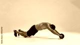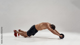 Muscular sportsman exercising with fitness ab roller