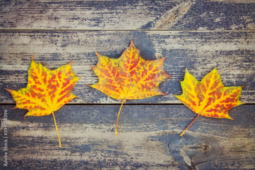 Colorful rich maple leaves, on the background of vintage boards