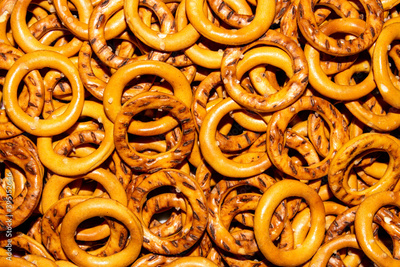 Salted crackers in rings.Beer snack.Cookies salty background.