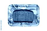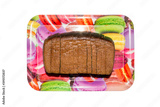 A loaf of black Russian bread on a white background.Black bread cut into pieces.Loaf of bread with bran sliced.