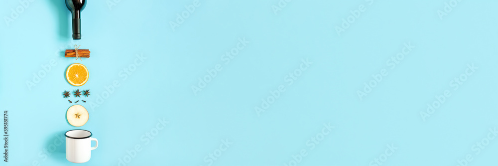 Mulled Wine Ingredients, still life on blue background. Bottle of wine, cinnamon sticks, slices of orange, apple, anise and mug. Concept culinary recipe holiday drink Creative Top view Flat lay