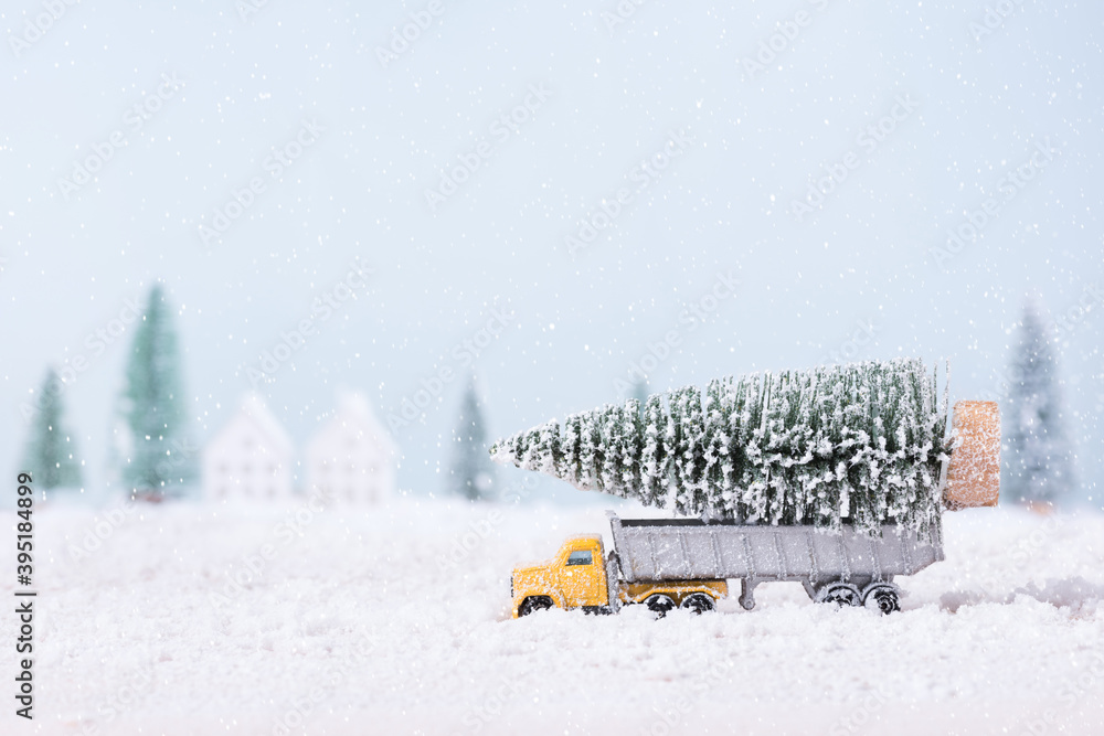 Christmas tree on toy car truck was running through the snow in the field of natural Landscape background