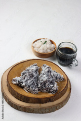 Kue lupis ketan hitam as traditional Indonesian sweet sticky rice dumplings of black glutinous rice with grated or shredded coconut and palm sugar syrup