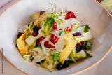 vegetable salad bowl with asparagus, fennel, avocado, raisins and mix lettuce.