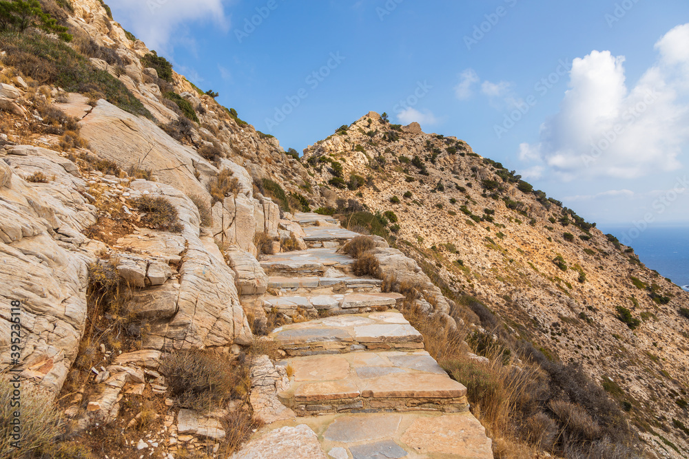 Stone mountain path to Palaiokastro, Ios Island, Greece.