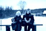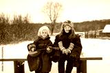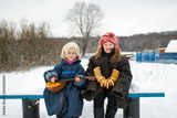 Two beautiful village girls sit on the bench with balalaika and barankas in winter