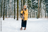 Young stylish hipster girl in yellow jacket with a warm scarf walking in the snow forest