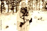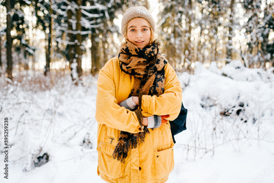 Young stylish hipster girl in yellow jacket with a warm scarf posing in the snow forest