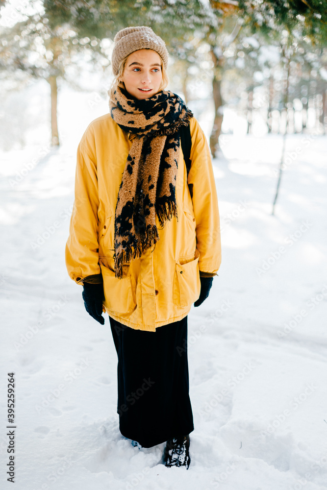 Young stylish hipster girl in yellow jacket with a warm scarf walking in the snow forest