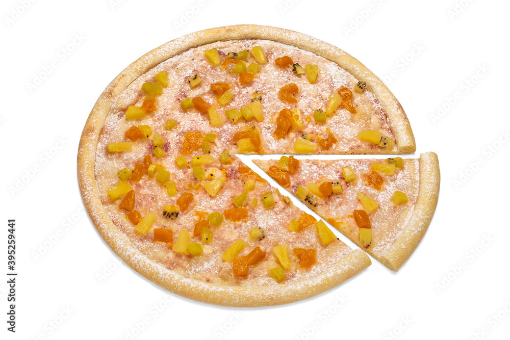 Fruit sweet pizza for dessert. Concept for flyer, advertising poster, restaurant menu.