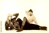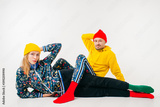 Stylish cute couple of man and woman in colorful clothes posing over white background