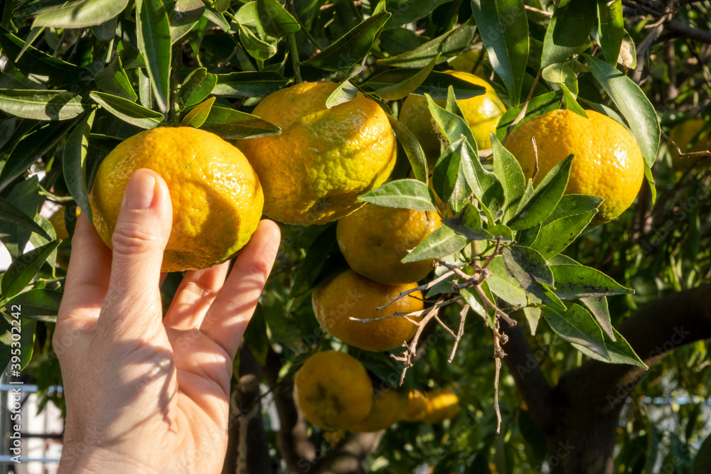 Focus on a human hand picking up a single mandarin from a tree. Many other fruits are hanging between green leafs. Sun reflects on shell surface