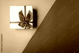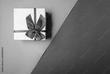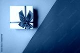 Festive Christmas and new year decoration with gift box on red and blue background.