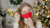 Tired woman take off protective face mask while standing in festive decorated home for Christmas