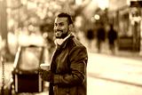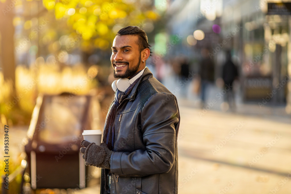 Handsome young young man drinking coffee in the street
