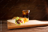 Tasty fresh wrap sandwich with beef and vegetables and glass of cola, on wood table