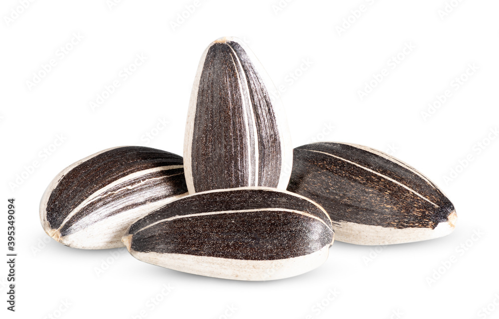 Group of sunflower seeds closeup isolated on white background