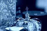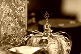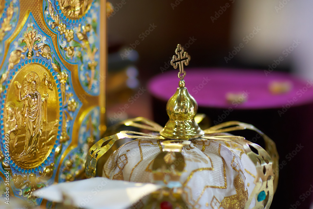 Golden crown and bible on altar in church at wedding matrimony. traditional religious wedding ceremony