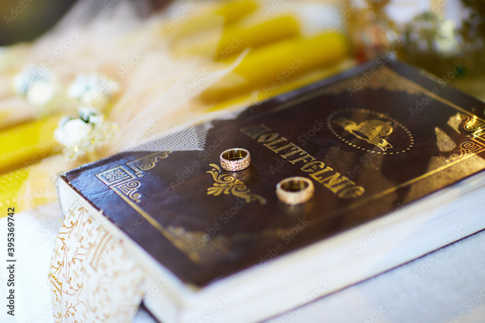 An old bible with two gold rings on it. Canonical book for the church registration of marriage