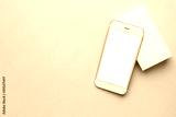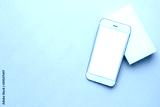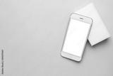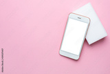 Mobile phone with blank screen and white rectangular shapes on pink background
