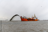 Vessel engaged in dredging. Dredger working at sea. Ship excavating material from a water environment.