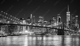 Black and white night view of Manhattan waterfront, New York City, USA.