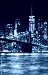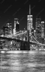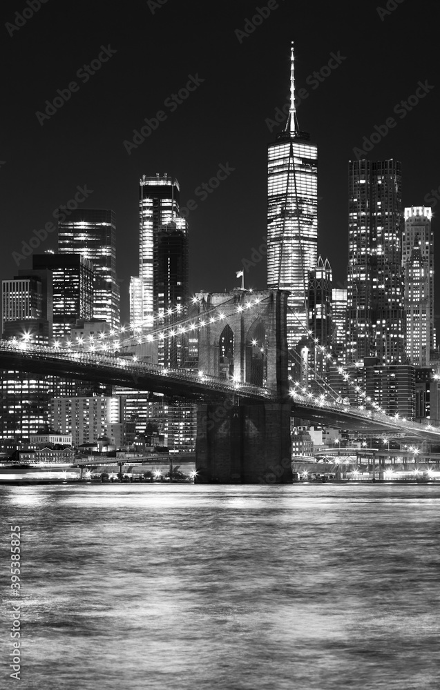 Black and white night view of Brooklyn Bridge and Manhattan waterfront, New York City, USA.