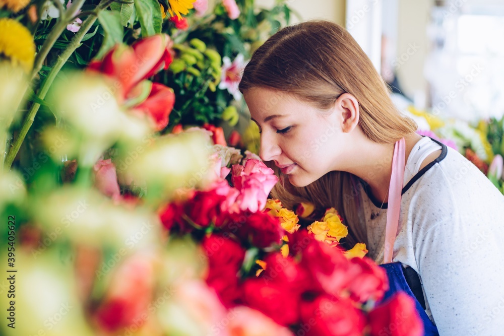 Young florist smelling beautiful fresh flowers in a flower shop.