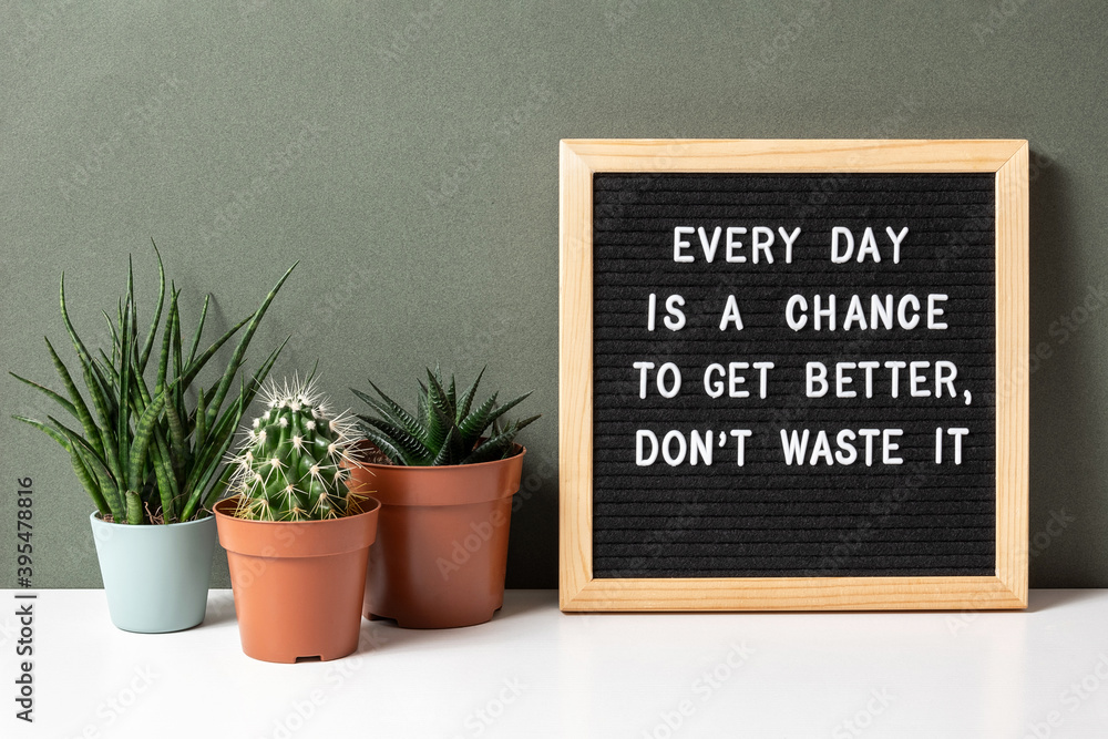 Every day is a chance to get better, don't waste it. Motivational quote on letter board, cactus, succulent flower on white table. Concept inspirational quote of the day. Front view.