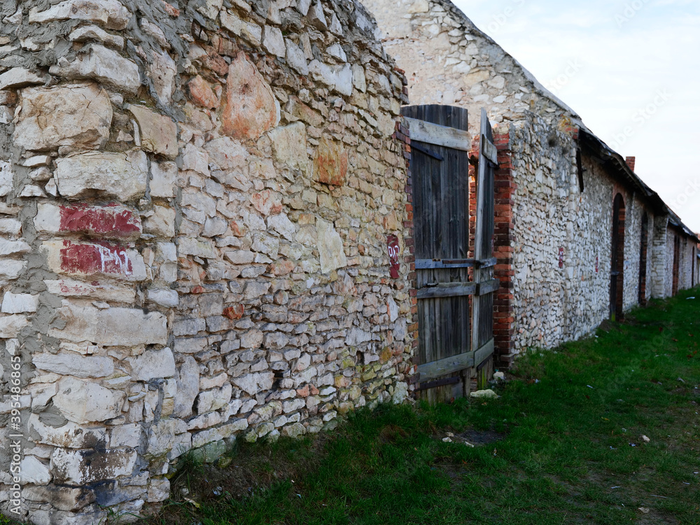 Kamienne stodoły z końca XIX i początku XX w Zarkach w promieniach zachodzącego słońca