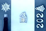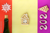 bottle of sparkling wine, gingerbread house, and the number 2021. celebrating the new year at home