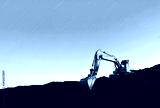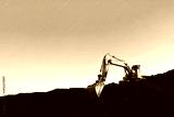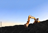 Excavator during earthmoving at coal open pit on sunset background. Construction machinery and earthworks heavy equipment for excavation at quarry. Recyclin and coal mining industry