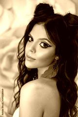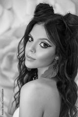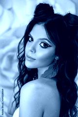 Beauty fashion model girl with creative art makeup and blue feather earring. Portrait of Beautiful brunette posing in studio, colorful glowing make-up.