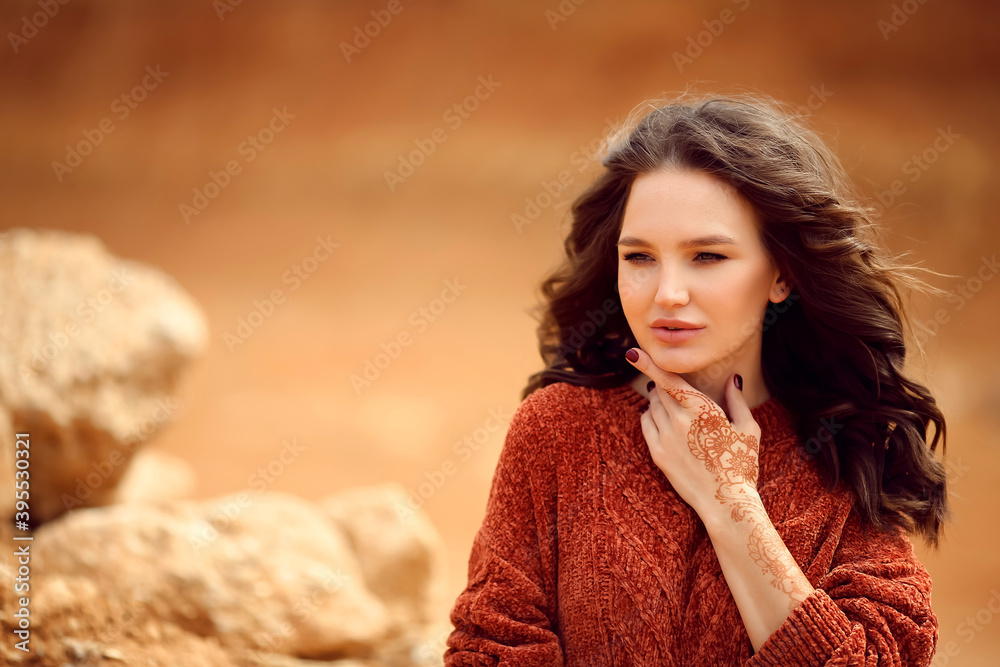 Henna Mehndi. Mehendi on hands. Outdoor portrait of attractive woman in sweater with curly hair.