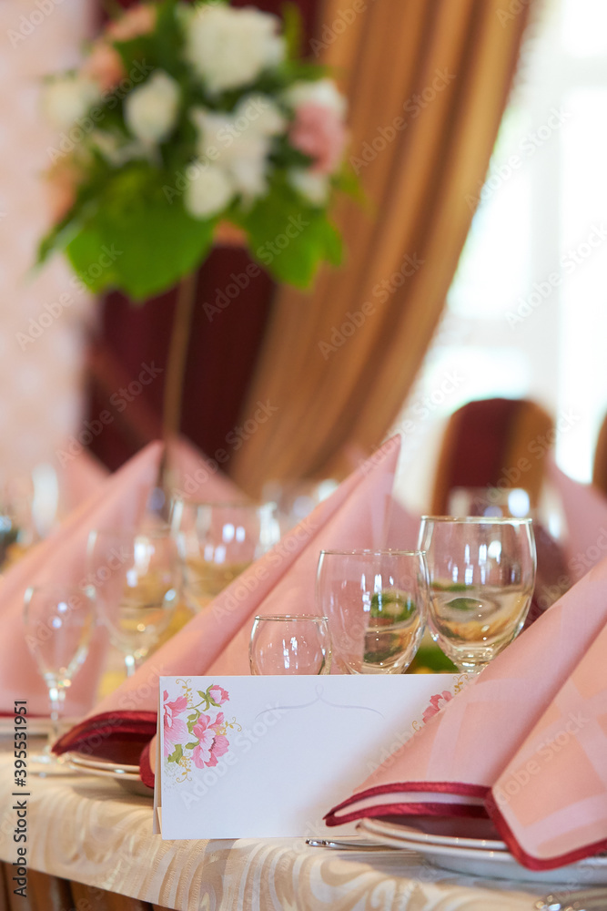 Wine glasses on a white festive table. table set for wedding or another catered event dinner ceremony. for newlyweds