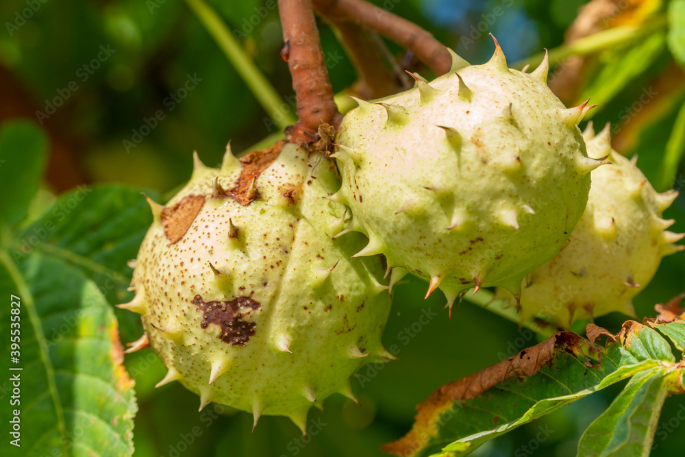 Closeup of a group of wild chestnuts hanging on a branch full with green leaves at autumn. Natural background.