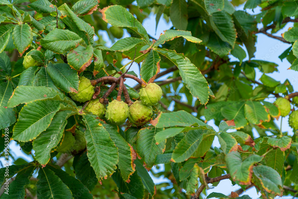 A group of wild chestnuts hanging on a branch full with green leaves at autumn. Natural background.