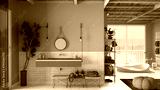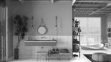 Cosy wooden peaceful bathroom in gray tones, bathtub, ceramic tiles, sink with mirror and little potted tree, pouf, shelves, big window, spa, hotel suite, modern interior design
