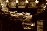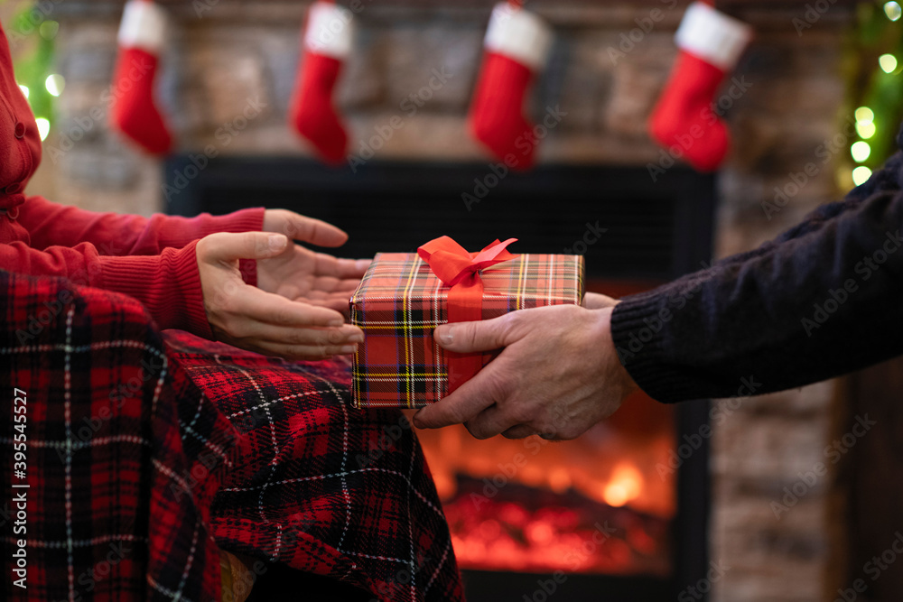 Man giving Christmas and New Year Gift box to woman in front of the fireplace with flame.