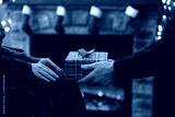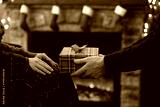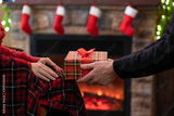 Man giving Christmas and New Year Gift box to woman in front of the fireplace with flame.