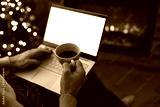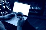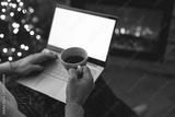 Christmas. Man with laptop sitting near christmas tree and fireplace. Concept of online service in holidays. Back view.