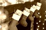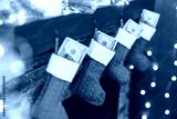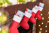 American, US dollars in сhristmas red socks for gifts on the fireplace in bokeh lights.
