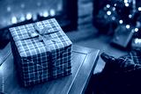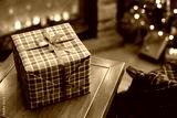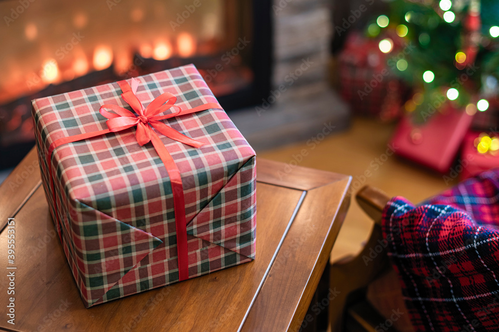 Armchair with plaid, packing gift boxes for family near christmas tree and fireplace. Top view
