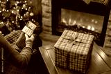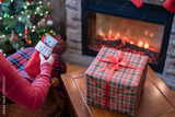 Woman putting american dollars in red christmas sock sitting near christmas tree and fireplace and packing gift box. concept.