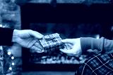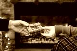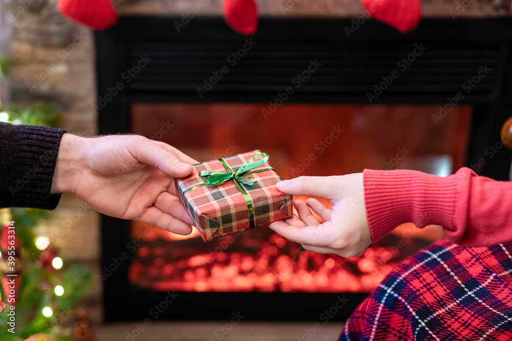 Man giving Christmas and New Year Gift box to woman in front of christmas tree, fireplace with flame. Xmas concept.