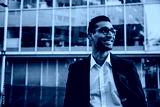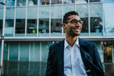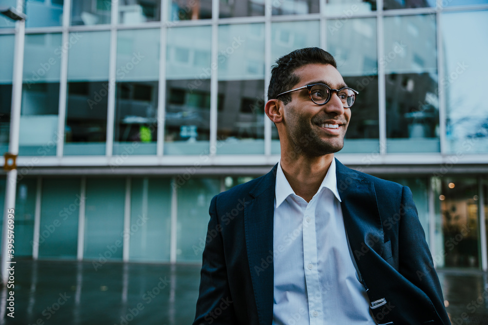 Middle-aged businessman wearing spectacles smiling standing outside banking office building