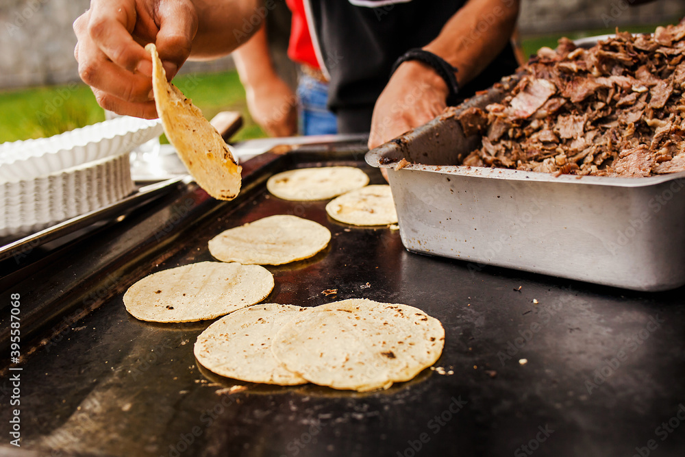 Taquero and tortillas Mexican man preparing tacos al pastor in Taqueria in Mexico city