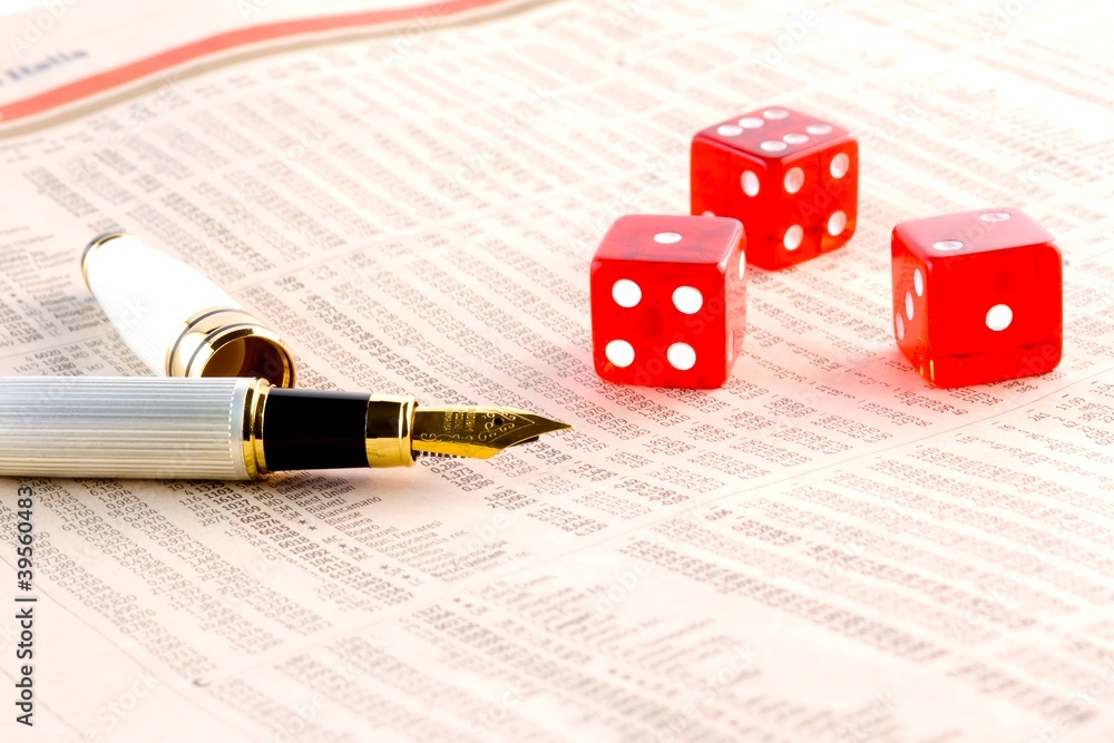 red dice and a golden pen on the financial newspaper