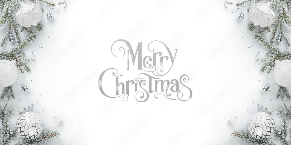 Merry Christmas frame made of white and silver decorations, fir branches, sparkles and confetti on white background. Xmas and New Year holiday, bokeh, light. Flat lay, top view